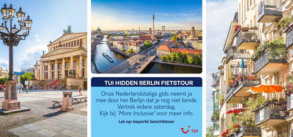 - Wie op zaterdag met TUI in Berlijn is, krijgt een mooie fietstour door het Verborgen Berlijn. TUI trakteert! De fietstour start elke zaterdag om 14:30 uur. Vanaf 27.10.25 t/m 28.03.26 start de tour om 10.30 uur. De tour geeft een mooie inkijk in de andere kant van Berlijn en start vanaf Biergarten Jules aan de Luckenwalder Str. 6b. Dit ligt schuin onder het U-bahn station Gleisdreck en is bereikbaar met de U1 of U2. Onderweg hoor je interessante verhalen over de roerige geschiedenis van de stad en zie je de minder bekende locaties van de stad. Uiteraard vang je ook een glimp op van enkele niet te missen highlights. Als je een stedentrip naar Berlijn boekt, krijg je bij stap 2 in het boekingsproces de mogelijkheid om de Nederlandstalige fietstour bij te boeken. Er zijn maar een beperkt aantal plaatsen beschikbaar. Krijg je tijdens het boeken geen optie om de tour te selecteren, dan zit deze helaas vol.